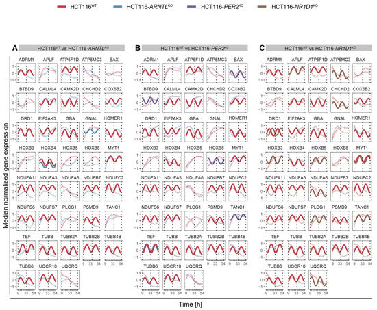 Circadian expression profiles of PD-associated genes. (A) in HCT116WT and HCT116-ARNTLKO (B) in HCT116WT and HCT116-PER2KO (C) in HCT116WT and HCT116-NR1D1KO. Rhythmicity analysis was computed considering a 24-h period. Depicted are significantly rhythmic genes (q < 0.05 and relative amplitude ≥ 0.1) plotted using a harmonic regression fitting (full lines), whereas not significantly rhythmic genes were represented with LOESS (dashed lines) (see Figure S3 for similar analysis in SW480 and SW620 cells).