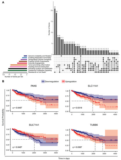 Correlation of genes resulting from the analysis with CRC cell lines and the cohort of IPD patients, with cancer hallmarks and survival in a colon adenocarcinoma cohort. (A) The plot depicts the intersection of cancer-hallmarks-related genes (retrieved from the CHG database [56]) and relevant genes highlighted by our analysis (Table S11). The colour coded bar plots (left) indicate the number of genes related to a particular cancer hallmark. The genes found to be associated with more than one hallmark are indicated with connecting lines (right). The number of unique genes and genes associated with more than one cancer hallmark are indicated above the grey bar plots (right). (B) Kaplan–Meier survival curves for genes found to be common in our analysis and genes associated with patient survival in the TCGA-COAD cohort. The patient cohort was separated into two groups based on the median gene expression level as high and low expression groups and a comparison of survival time (in days) was performed. In a subsequent analysis, using cancer stage as stratification of the patients, the following q-values were obtained: PAK6, q = 0.036; SLC11A1, q = 0.005; SULT1A1, q = 0.27; TUBB6, q = 0.01 (see also Table S12).
