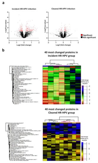 In total, 5939 proteins were identified in the 44 cervical samples. First, we assessed whether the proteome changed in samples that were HPV negative at baseline and where HR-HPV infections were present at follow-up (incident HR-HPV group; n = 7). In paired samples between uninfected at baseline and HR-HPV infected at follow-up, 181 proteins were up-regulated, and 133 proteins were down-regulated at follow-up (HPV incident group; Figure 1a). Close to all of the 40 most changed proteins in the HPV incident group were up-regulated (Figure 1b).