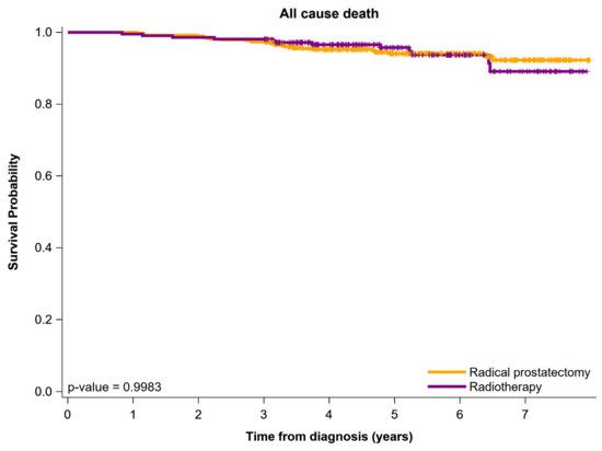 - Huang, H.; Muscatelli, S.; Naslund, M.; Badiyan, S.N.; Kaiser, A.; Siddiqui, M.M. Evaluation of Cancer Specific Mortality with Surgery versus Radiation as Primary Therapy for Localized High Grade Prostate Cancer in Men Younger Than 60 Years. J. Urol. 2019, 201, 120–128. [Google Scholar] [CrossRef] [PubMed]