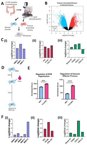 Stromal cells in the colon tumour microenvironment are altered and increase expression of matrix remodelling, ECM and immunomodulation transcripts. (A) Schematic description of how samples from GSE35602 were processed. (B) Volcano plot of tumour-associated stroma (n = 13) versus normal stroma (n = 4) differential mRNA expression (GSE35602). (C) Fold change of mRNA levels related to matrix remodelling (MMP2, MMP3, MMP11) (i), ECM deposition (FN1, VCAN, COL1a1, COL11A1) (ii) and immune modulation (Serpin E1, TGFβ1, CXCL1, CXCL12) (iii) in tumour-associated stroma versus normal stroma (GSE35602). (D) Schematic description of treatment timeline for mMSC TCS conditioning. (E) Gene set enrichment analysis results for control mMSC (blue) (n = 3) and TCM mMSC (Pink) (n = 3) RNAseq. (F) Fold change of mRNA levels related to matrix remodelling (MMP2, MMP3, MMP9, MMP11, MMP13) (i), ECM deposition (FN1, VCAN, COL1a1) (ii) and immune modulation (Serpin E1, TGFβ1, CXCL1, CXCL12) (iii) in normal mMSC versus TCS mMSC. Error bars represent mean ± SD. *** p < 0.001, **** p < 0.0001 by t test.