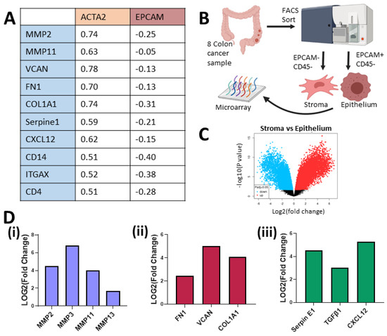Stromal cells in the TME express higher mRNA levels than the tumour cells for a number of matrix remodelling, ECM and immunomodulation genes. (A) Spearman correlation from mRNA of bulk colorectal adenocarcinoma, TCGA, PanCancer Atlas, cBioportal (n = 592). (B) Schematic description of how samples from GSE39397 were processed. (C) Volcano plot of stroma (−EpCAM, −CD45) versus epithelium (+EpCAM, −CD45) from colon cancer tumours’ (n = 8) differential mRNA expression (GSE39397). (D) Fold change of mRNA levels related to matrix remodelling (MMP2, MMP3, MMP9, MMP11, MMP13) (i), ECM deposition (FN1, VCAN, COL1A1) (ii) and immune modulation (Serpin E1, TGFβ1, CXCL12) (iii) in tumour-associated stroma versus cancer epithelium (GSE39397).