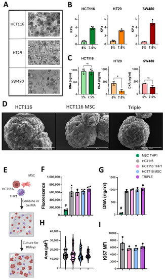 GelMA culture system supports the growth of colon cancer cell lines within triple culture system. (A) Light microscopy images of spheroid formation from 3 CRC cell lines, HCT116, HT29 and SW480, at day 10 culture in 5% GelMA hydrogel, 20× magnification. (B) Rheometry measurements of GelMA stiffness at day 10 of culture (n = 3–5). (C) Proliferation of CRC cells at day 10 in 5% and 7.5% gels (n = 2–3) measured by CyQuant DNA analysis. (D) Representative SEM images of spheroid isolated from gels at day 10, scale = 50 μm. (E) Schematic description of 10-day GelMA triple culture system. (F) Alamar Blue measure of metabolic activity of cell contain gels at day 10 (n = 4). (G) Proliferation of cells at day 10 (n = 2) measured by CyQuant DNA analysis. (H) Spheroid size at day 10 (biological n = 5, technical n = 5). (I) Flow cytometry Ki67 expression in EpCAM positive cells isolated at day 10 (n = 3). Individual values are displayed as black dots on bar charts. Error bars represent mean ± SD. * p < 0.05, # p < 0.005 compared to all other groups, by t test or one-way ANOVA and Tukey post hoc test.