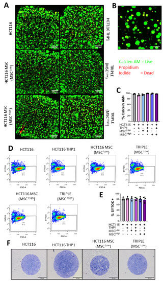 The viability of the tumour spheroids, primary MSCs and monocytes was an important consideration when developing our 3D CRC model. Hence, we performed live/dead imaging that captured almost the full field of view for the 3D cultures (Figure 4A). There was no cell death apparent in the centre of the cell-containing hydrogels, suggesting good perfusion of nutrients throughout the hydrogel. Upon examination of a higher magnification of the 3D triple (MSChigh) cultures, we found larger spheroids, indicative of HCT116 cell growth, and elongated cells characteristic of primary MSCs (Figure 4B). The spheroid viability was assessed by quantifying the staining intensity, yielding over 90% viability in each 3D culture condition (Figure 4C). We also observed intact cellular structures within the spheroids in addition to the external layer, indicating that viability is maintained throughout the spheroids (Figure 4F).
