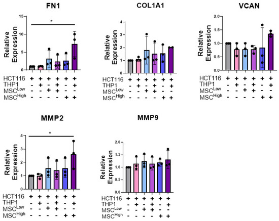 A significant increase in FN1 mRNA expression was observed in the triple culture (MSChigh) compared to the cancer cells alone or cancer cells embedded with THP-1 (Figure 5). Similarly, although not significant, there is a trend toward an increase in COL1A1 and VCAN expression in the triple culture (MSChigh) compared to 3D CRC cell monocultures (Figure 5). We observed a significant upregulation of MMP2 transcripts when MSCHigh and THP1s were added to the cancer cells compared to the cancer cells cultured alone. These results suggest that the addition of stroma, with a preference for high-density mesenchymal stroma, contributes to or induces the transcription of ECM genes and matrix remodelling genes that have been shown to promote tumour progression.