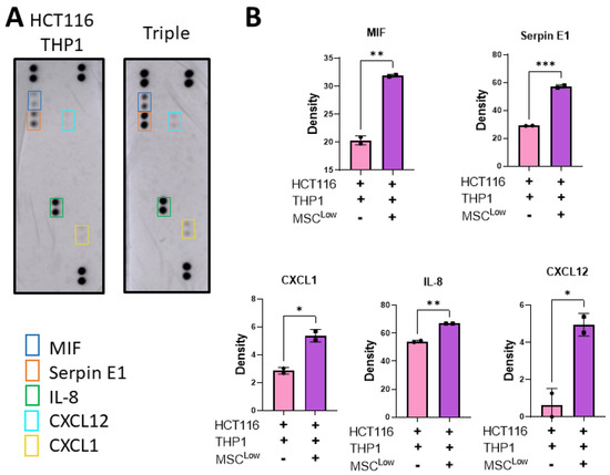 The tumour immune environment can affect tumour progression and response to therapeutics. As the target of emerging therapeutics, macrophages have the capacity to function as either pro-tumour or anti-tumour effectors, which is dictated by the cues in their microenvironment. The addition of MSCs to the culture system (HCT116 and THP1s) increased the release of CXCL1 (Neutrophil-Activating Protein 3), CXCL12 (stromal cell-derived factor 1 α), IL-8 (CXCL8), MIF (macrophage migration inhibitory factor) and SerpinE1 (Plasminogen Activator Inhibitor 1) (Figure 6A,B).