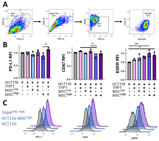 A similar trend is seen with the expression of the “don’t eat me” signal CD47, which binds to its receptor SIRPα on macrophages. Targeting of the CD47-SIRPα axis is being tested in numerous cancer types. The cancer cells cultured with MSCHigh expressed significantly lower levels of CD47 than those cultured with the monocytic cell line (Figure 7B), reinforcing the hypothesis that stromal cells can act on the cancer cells to alter the function and phenotype. Anti-EGFR antibodies are the most common targeted therapy used in the treatment of colon cancer. They act by blocking EGFR signalling, which reduces cell growth and survival signalling and can induce antibody-dependent cellular cytotoxicity [65]. In contrast to PD-L1 and CD47 expression, the induction of EGFR on the cancer cells was significantly increased when cultured with high-density MSCs but was unchanged by the incorporation of the innate immune cell compartment (Figure 7B,C). Taken together, these results further illustrate the complex nature of cellular interactions with the CRC TME and how they can have a significant impact on cancer cell expression of therapeutic targets and immunomodulatory markers.