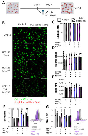 EGFR blocking/inhibition is the most successful targeted therapy for the treatment of CRC to date [66]. Our model reveals that EGFR expression is increased on CRC when cultured with stromal cells. To assess the role of the stromal compartment in altering cancer cells’ response to treatment, we used the EGFR tyrosine kinase inhibitor PD153035. GelMA experimental groups were treated at days 4 and 7 with PD153035 (Figure 8A). While PD153035 has been shown to have cytostatic and cytotoxic effects [67,68], live/dead imaging of the spheroids did not display significant cell death following treatment with the EGFR inhibitor at 1 μM (Figure 8B,C). No significant differences in metabolic activity or Ki67 expression were observed between groups (Figure 8D,E). This is likely due to the HCT116 Kras mutant status that promotes survival and cell growth signalling [69,70,71].