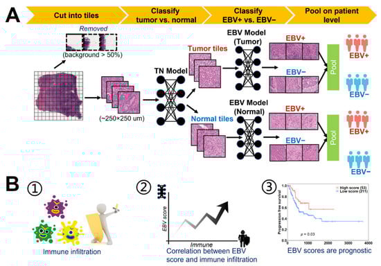 Schematic design of the study: (A) Deep-learning-based pipeline for predicting EBV status. The tumor vs. normal model (TN model) was first applied to distinguish tumor and normal tiles, and EBV models were then trained on tumor and normal tiles separately to predict EBV status. (B) Downstream analysis of models predicting EBV scores. (1) Comparing immune infiltration between samples with high and low EBV scores led us to hypothesize that our model was at least partially influenced by regional immune infiltration. (2) To test this hypothesis, we examined local correlations between EBV scores and immune infiltration. In spite of high correlations, our model outperformed predictions based solely on immune infiltrations. (3) Besides, our model can provide additional prognostic values compared to EBV status and immune infiltration.
