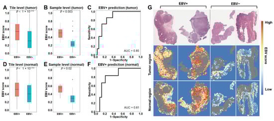 For EBV models trained on either tumor (tEBV model) or normal (nEBV model) tiles, a sample-level EBV score is calculated by the proportion of predicted EBV+ tiles across all tumor or normal tiles from each sample. Area under the curve (AUC) of the receiver operating characteristic was used to evaluate model performance on test sets. Specifically, slides with too few normal tiles (fewer than 10) or with handwriting on normal regions were considered as low quality and discarded for evaluation and downstream analysis of the nEBV model.