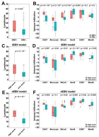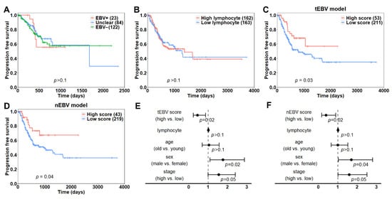 Having shown that our model is partially driven by regional immune infiltrations, we next examined whether our model could provide additional prognostic value beyond immune infiltration and EBV status. To start with, we compared survival differences among patients with EBV+ (>100 RPHM), unclear (0~100 RPHM) and EBV− (0 RPHM) status. As shown in Figure 6A, all three groups of patients showed comparable progression-free survival rates. Next, we examined how immune infiltration affects progression free survival. After dichotomizing the patients into high and low lymphocyte-infiltrating groups based on their median value, we observed no significant survival differences between the two groups (Figure 6B). Additionally, we calculated EBV scores for each sample by applying the EBV models. After excluding training samples, patients with high scores were found to have significantly longer progression-free survival compared to those with low scores using both the tEBV (p = 0.03, Figure 6C) and nEBV (p = 0.04, Figure 6D) models. After considering established clinical variables including lymphocytes, age, sex and tumor stage, the association of the EBV score with prognosis remained significant in the multivariate Cox regression model. Patients with high EBV scores have a 55% or 61% lower risk of progression than those with low scores using the tEBV (Figure 6E) or nEBV (Figure 6F) model, respectively.