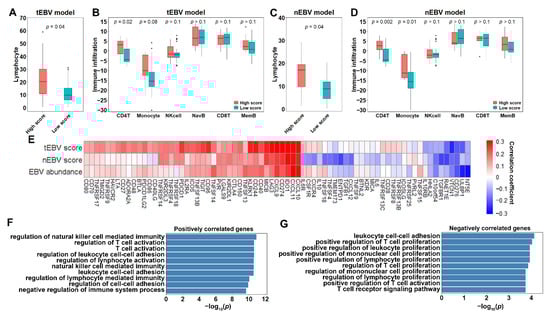 Association of EBV scores with immune infiltration: (A,B) Infiltration of lymphocyte (A) and six major immune cell subtypes (B) in tumor regions for high and low tEBV score samples with zero EBV abundance. (C,D) Infiltration of lymphocyte (C) and six major immune cell subtypes (D) in normal regions for high and low nEBV score samples with zero EBV abundance. (E) Correlation of expression of immune-related genes with tEBV score, nEBV score and EBV abundance over the entire cohort. (F,G) Enriched gene ontologies for positively (F) and negatively (G) correlated genes. p values are calculated from one-sided (A,C) or two-sided (B,D) Wilcoxon rank-sum test.