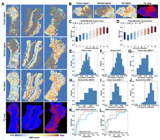 Having shown different immune infiltration between high and low score samples in cohorts of patients with low or zero EBV abundance, we hypothesized that regional immune infiltration in H&E slides was contributing to the EBV model prediction. To test this hypothesis, we first visually compared model prediction results with tumor-infiltrating lymphocyte (TIL) maps, which were derived from a trained deep learning algorithm to distinguish lymphocyte-infiltrated patches based on a previous study [26,27,28]. As shown in Figure 5A, the heat maps of the EBV scores in both normal and tumor regions from some slides were found to be matched extremely well with the corresponding TIL maps. Taking a slide as an example (Figure 5B), we further quantified the correlation of regional immune infiltration with EBV scores in both tumor and normal regions. Specifically, we mapped tiles’ positions to the corresponding TIL map and calculated tile-level immune infiltration, represented by lymphocyte-infiltrated area divided by tile area. Furthermore, tile-level immune infiltrations were categorized into 10 levels, corresponding to the ratio of lymphocyte pixels to total number of pixels in the area: level 1 would be tiles with a ratio of 0~0.1, level 2 would be 0.1~0.2, and up to level 10, which would be 0.9~1. As shown, tiles with higher immune infiltrations had higher EBV scores, resulting in high correlation coefficients in both tumor (R = 0.54, Figure 5C) and normal regions (R = 0.48, Figure 5D). We then extended our analyses to all H&E slides. After excluding low quality slides, we found high correlations between immune infiltration and EBV scores from both tumor and normal regions across slides, with positive correlations in 213 out of 227 tumor regions (Figure 5E) and in 182 out of 197 normal regions (Figure 5F). According to EBV abundance, we next stratified the H&E slides into 3 categories: 25 EBV+ (>100 RPHM), 116 EBV− (0 RPHM) and 86 low EBV abundance (0~100 RPHM). Among EBV+ slides, 21 out of 25 and 21 out of 21 slides were observed with positive correlations for tumor (Figure 5G) and normal regions (Figure 5H), respectively. These results were further validated in EBV− slides, with 113 out of 116 slides and 94 out of 101 slides exhibiting positive correlations in tumor (Figure 5I) and normal regions (Figure 5J). Similar results were found for slides with low EBV abundance: 79 out of 86 and 67 out of 75 slides had positive correlations in their tumor (Figure S6A) and normal regions (Figure S6B).