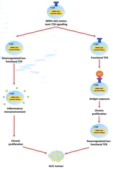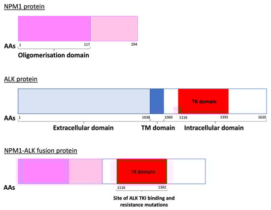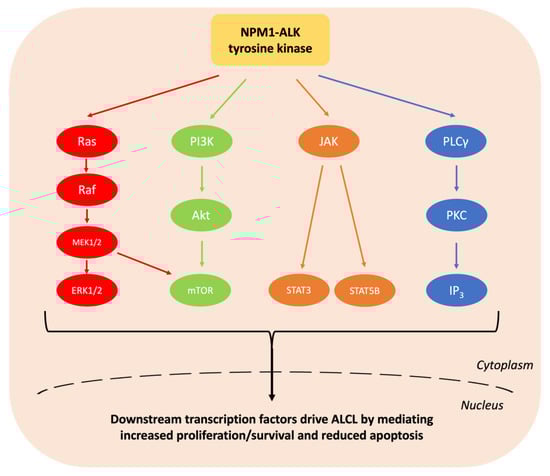 - Shi, P.; Lai, R.; Lin, Q.; Iqbal, A.S.; Young, L.C.; Kwak, L.W.; Ford, R.J.; Amin, H.M. IGF-IR tyrosine kinase interacts with NPM-ALK oncogene to induce survival of T-cell ALK+ anaplastic large-cell lymphoma cells. Blood 2009, 114, 360–370. [Google Scholar] [CrossRef] [PubMed]