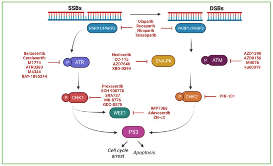 Poly(ADP-ribose) polymerases inhibitors (PARPi) that target both the PARP-1 and PARP-2 enzymes (e.g., olaparib, niraparib, rucaparib and talazoparib) have been the first DDR-targeting compounds approved for treatment of some tumours bearing homologous recombination (HR) DNA repair deficiencies [3], acting on the principle of synthetic lethality [4,5]. Other critical components of the DDR, including ataxia telangiectasia and Rad3-related (ATR), ataxia telangiectasia mutated (ATM), DNA-dependent protein kinase (DNA-PK), Checkpoint kinase 1 (CHK1), Checkpoint kinase 2 (CHK2) and Wee1 kinase (WEE1), are also promising as targets for fighting cancer [6,7]. Compounds that aim to inhibit these proteins are now at different phases of clinical development as either monotherapies or in combination with other therapies, mainly immunotherapies; it is expected that some of them will be approved for clinical use in the short term [6,8] (clinicaltrials.gov; accessed on 1 October 2021) (Figure 1).