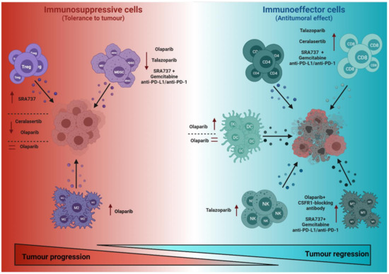 MDSCs represent a heterogeneous group of immature myeloid cells associated with immunosuppressive functions in the TME that contribute to tumour progression [17]. Accordingly, interfering with their recruitment to the TME and/or blocking their functional activity may improve the immune response to tumours. For instance, olaparib treatment suppresses MDSC migration to the TME [18]. The mechanisms underlying this effect appear to be based on olaparib downregulating the expression of stromal cell-derived factor 1-alpha (SDF1α), which is released to the TME by cancer-associated fibroblasts (CAF) and reduces CXCR4-mediated MDSC migration [18]. Interestingly, this olaparib-mediated decrease of infiltrating MDSCs in the TME improved the therapeutic efficacy of chimeric antigen receptor (CAR)-T cells in a mouse model of breast cancer [18]. Likewise, using the PARPi talazoparib encapsulated in a bilayer of a nano-liposome also decreased the levels of MDSCs, in both tumour and spleen in a mouse model of breast cancer [19]. Similarly, olaparib treatment reduced the granulocyte component of the MDSC population in a mouse model of breast cancer susceptibility genes 1 (BRCA1)-deficient ovarian cancer [20]. Strikingly, in a colon cancer model, moderate doses of olaparib only had a minor impact on the migration of MDSCs into the tumour, but inhibited the immunosuppressive activity of intratumour MDSCs and enhanced the response to anti-PD-1 therapy [21]. In addition to PARPi, treatment with a combination of the CHK1i SRA737 and the antimetabolite agent gemcitabine plus anti-PD-L1/anti-PD-1 also decreased MDSCs in a small cell lung cancer (SCLC) model [22].
