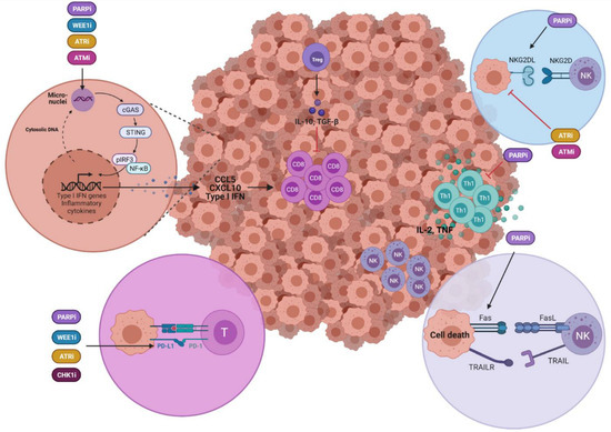 62. Wu, X.; Kang, X.; Zhang, X.; Xie, W.; Su, Y.; Liu, X.; Guo, L.; Guo, E.; Li, F.; Hu, D.; et al. WEE1 inhibitor and ataxia telangiectasia and RAD3-related inhibitor trigger stimulator of interferon gene-dependent immune response and enhance tumor treatment efficacy through programmed death-ligand 1 blockade. Cancer Sci. 2021, 112, 4444–4456. [Google Scholar] [CrossRef]