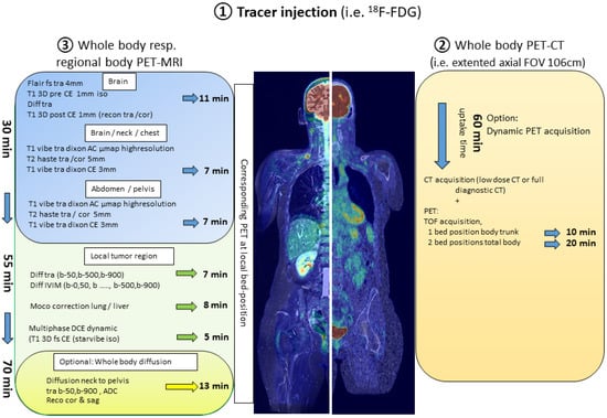 Regarding PET-MRI, the question that inevitably arises is, if there is an added benefit in the management of oncological patients, especially in diagnostic centers or departments, in which PET-CT is already available. The answer is most probably not a simple one. Although, a combination of whole-body hybrid imaging with both PET modalities would result in a plethora of potentially beneficial, complementary, morphologic, metabolic, and functional information, issues related to patient tolerance (acceptance), as well as logistical considerations with regard to the workflow of the department may render this attempt relatively impractical at first sight. This problem may be solved with the application of modified, faster PET-MRI acquisition protocols. These workflows include, for example, an initial whole-body PET-CT (optimally with new generation scanners offering faster whole-body coverage) followed by fast whole-body PET-MRI acquisitions, which can be completed within less than 20 and 30 min, respectively, within one single radiotracer injection [15,16]. Another algorithm involves dedicated local PET-MRI imaging of defined body regions (typically the main tumor region and the brain, only). Considering that MRI is the anatomic imaging modality of choice in certain cancers, it would be reasonable to combine whole-body PET-CT with regional PET-MRI including full diagnostic and functional MRI-coverage of the distinct body/tumor region. Advantages of this combination of hybrid PET modalities are evident, involving the superiority of CT, e.g., for lung parenchyma imaging—regarding both the detection of small noduli and other pathological conditions, such as treatment-related side effects—and, at the same time, the advantages of MRI in the morphologic evaluation of organs, such as the bone, liver, and brain parenchyma. Combining the workflows of both hybrid scanners would require a high level of strategic planning, but these protocols will very likely optimize the diagnostic gain. For the patient, this combination is feasible with no additional radiation burden and minimal extra time, since it would be performed with only one injection of radioactivity and require only one visit of the diagnostic department (Figure 1).