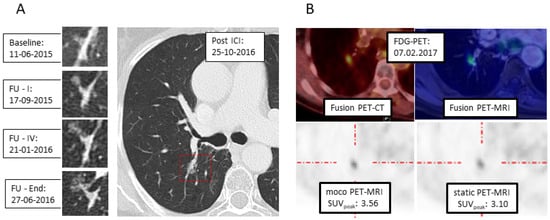 Motion correction is, moreover, one of the fields where this combined scanning could play a role: Although PET acquisitions are conducted with shallow breathing, still, organs and especially tumors in the lung are moving during the scan, which might induce blurring of the region of interest and inaccuracy in quantification. It has long been the aim to correct PET data for motion. With PET-MRI, motion correction has been introduced by monitoring, i.e., the lung motion by sagittal star-vibe sequences, acquired simultaneously to the PET acquisition [21]. One example is displayed in Figure 2. In this patient, the semi-solid nodular structure in the right lung, which developed slowly after immunotherapy, was further characterized as suspicious tumor recurrence/secondary cancer by 18F-FDG-PET-CT. Immediately after PET-CT, the patient was transferred to PET-MRI to establish a motion corrected baseline SUV-quantification for eventual further treatment regimen evaluation.