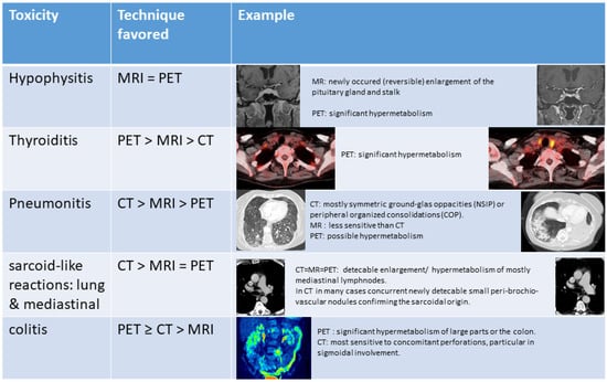 Moreover, ICIs are linked with the emergence of a new class of side effects, the immune-related adverse events (irAEs), which resemble autoimmune responses and may further complicate imaging assessment [27]. Concerning irAEs, the early detection of hypophysitis, thyroiditis, pneumonitis, and colitis, as well as the reliable differentiation of benign signs of immune activation, such as sarcoid-like reactions of the lung and mediastinal lymph nodes, from progressive disease, is crucial for the successful treatment and management of the patients (Figure 3).