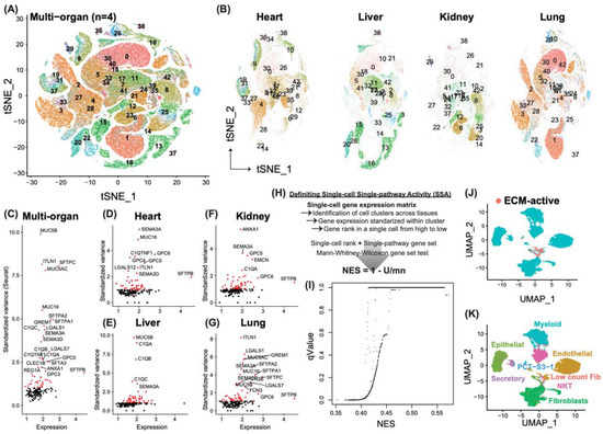 Identification of novel profibrotic cell types across multi-organ systems. (A) Overview of the 43 cell clusters using the single-cell tissue atlas. T-distributed stochastic neighbor embedding (t-SNE) of normalized transcriptomic data is shown. Each dot represents a single cell. (B) Cell clusters using t-SNE embeddings across different organ systems. (C) Standardized variance (defined by Seurat) of ECM pathway genes in the whole single-cell data set, with the most variable genes labeled in black. X-axis shows the median expression for each gene. (D–G) Standardized variance of ECM pathway genes across different organ systems, with the most variable genes labeled in black. X-axis shows the median expression for each gene. (H) Adapted computational pipeline of defining pathway activity at the single-cell level. (I) Dotplot showcases the distribution of single pathway activity, with normalized enrichment score (NES) plotted as x-axis, and significance level of q value as the y-axis. (J) Re-clustering of cells identified as ECM-active and their counterparts as non-EMC-active cells. Cells are colored based on their ECM activity. (K) Re-clustering of cells identified as ECM-active and their counterparts. Cell type annotations are labeled on the plot next to their corresponding clusters.