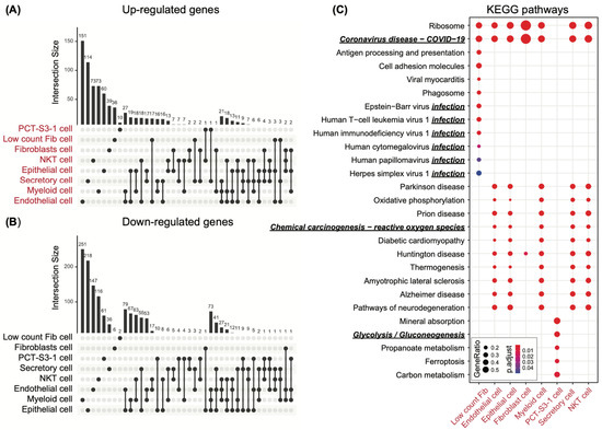 Profibrotic cell-type-specific differentially expressed genes and their KEGG pathway annotations. (A) Upset plot of cell-type-specific up-regulated genes while comparing ECM-active to non-ECM-active cell populations within the same cell type. (B) Upset plot of cell-type-specific down-regulated genes while comparing ECM-active to non-ECM-active cell populations within the same cell type. (C) KEGG pathway enrichment analysis using cell-type-specific up-regulated genes. Functions emphasized are labeled using italic, bold, and underlined text. Ratios for enriched genes against pathway size are filtered to be larger than 10%.