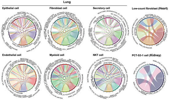 A co-active pathway network was then constructed using the top-enriched active molecular pathways, with linkage between pathways showing the percentage of ECM-active cells shared within each cell type. Pathways like Matrisome or ECM-related pathways share more common genes with the ECM pathway. More interactions among them are expected while constructing the co-active pathway network (Figure 3). In particular, we found that the copy number variation syndrome pathway is involved in all ECM-active cell populations within the lung. As a common mechanism for developmental neuropsychiatric disorders [44], the co-activity of this pathway is actually in line with our observations regarding the multiple up-regulated neurodegenerative disease-related pathways shared by different ECM-active cell types in the lung (Figure 2C). Another shared co-active signature pathway in the lung is the biological oxidations (REACTOME Identifier: R-HSA-211859), which accounts for genomic instability and has been implicated in the pathogenesis of several human diseases like fibrosis and cancers [45].