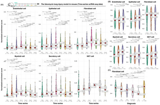 During the acute bleomycin-induced lung injury in mice, major cellular dynamics and desired responsive patterns were captured by our cell-type-specific gene signatures (Figure 4A). As demonstrated by their NES scores, myeloid, secretory, and NKT cells responded during rapid lung injury-induction as early as day 3 after being treated with bleomycin, while endothelial, epithelial, and fibroblast cells started responding to stimuli as early as day 7. Common responding patterns, regardless of cell types, peaked at day 10, which is consistent with prior observations [28]. A similar responsive trend held for NKT cells, but no significance was reached due to the insufficient and unbalanced cell numbers across the conditions.