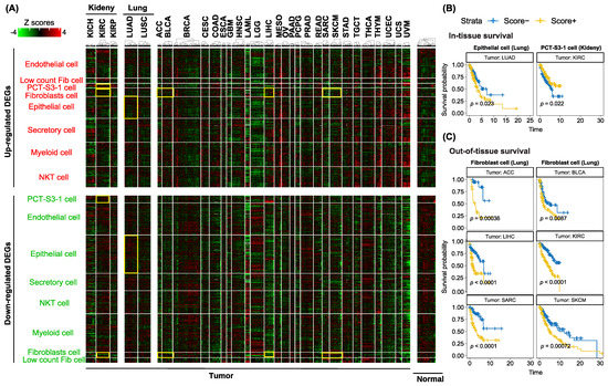An initial check on the gene expression patterns of all the differential genes in bulk tissue showed the absence of the profibrotic signatures in the tumor-adjacent normal samples, as expected (Figure 5A, Normal panel). Cell-type-specific differential gene signatures are present in some tumor types but they are not limited to the four organ systems included in our study. For instance, differential gene signatures from fibroblast cells in the lungs from our study presented in kidney renal clear cell carcinoma (KIRC) and bladder urothelial carcinoma (BLCA) patients. Survival analysis further confirmed the prognosis value of the profibrotic cellular scores, calculated based on these cell-type-specific differential gene signatures (Figure 5B,C). Some cell types showed uniqueness to a certain type of organ system, for example, epithelial cells to the lung and PCT-S3-1 cells to the kidney. A bidirectional trend in prognosis patterns between these two cell types was also observed (Figure 5B). Profibrotic score in epithelial cells of the lung indicated a worse prognosis effect in tumor patients with a higher profibrotic score (Figure 5B, left panel, p = 0.023). Interestingly, the profibrotic score calculated from PCT-S3-1 cells in the kidney showed an opposite trend in kidney cancer (Figure 5B, right panel, p = 0.022). This observation is actually consistent with our co-active pathway analysis in the kidney; in the kidney Circos plot (Figure 3), one of the top co-active pathways imposed a protective role in potential renal lesions. In TCGA cancer types of adrenocortical carcinoma (ACC), bladder urothelial carcinoma (BLCA), liver hepatocellular carcinoma (LIHC), kidney renal clear cell carcinoma (KIRC), sarcoma (SARC), and skin cutaneous melanoma (SKCM), we found consistently worse effects of higher fibroblast-derived profibrotic scores in predicting cancer prognosis.