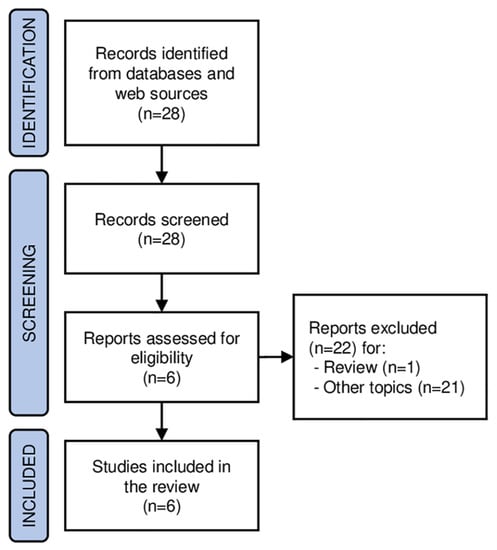 A total of 28 studies were screened for eligibility, of which 6 met the inclusion criteria and were, therefore, selected for further analysis (Figure 1). All studies were based on human patients. The average number of patients included in the studies was 72 (range 52–101). For each study, the list of clinical characteristics is reported in Table 1.
