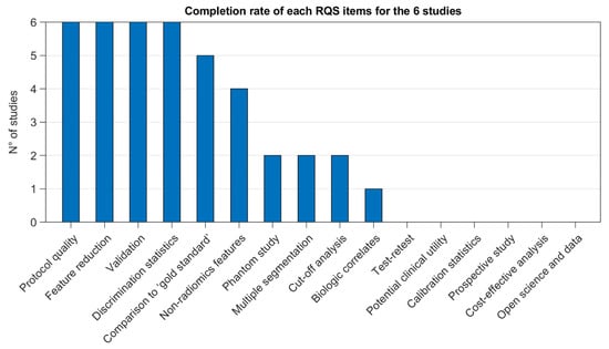 Completion rate of each item of the RQS metric considering all studies. Items evaluate six different domains, i.e., protocol quality, feature selection and validation, clinical validation and utility, model performance, study level of evidence, and open science.