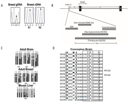 Analysis of the canonical CpG island covering the KCNK9 promoter region, transcription factor binding sites, transcription start site, and first exon identified no allele-specific methylation (Table A1). Expanding the search by a bioinformatic approach, using ENCODE data and cross-species sequence conservation, we identified a KCNK9 upstream region (KCNK9-US1) that had characteristics of an imprint regulatory sequence (Figure 1B). Approximately 20 kb upstream of the KCNK9 start site is a 500 bp region (chr8:140,732,400-140,732,870 GRCh37/hg19) containing areas of strong cross-species conservation, DNase hypersensitivity, and binding of multiple transcription factors [38,39,40]. Immediately adjacent to the conserved sequence is a cluster of CpG sites, but the sequence containing these dinucleotides has no cross-species conservation [39]. Quantitative methylation analysis by Sequenom MassArray identified intermediate methylation (20–70%) for five consecutive CpG sites within this adjacent region in brain, breast, liver, and testis from eight different adults (Table 1). These differentially methylated CpG sites are not within the ENCODE defined DNase hypersensitive region, nor the majority of the transcription factor binding regions [38]. Sequencing of PCR clones shows continuity of methylated or unmethylated cytosines for this region in DNA from the adult brain, with the adult breast showing a higher average methylation level (Figure 1C).