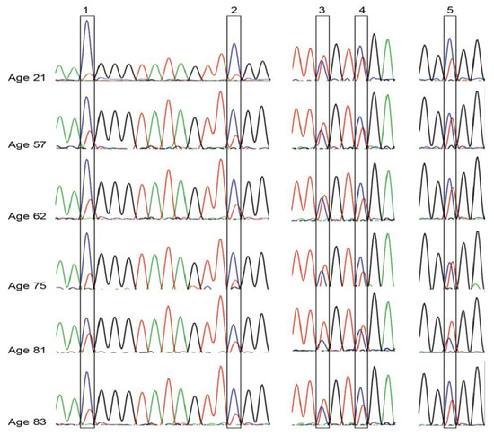 We used bisulfite sequencing to determine (1) the consistency of KCNK9-US1 DMR methylation in individuals without breast cancer and (2) whether KCNK9-US1 DMR hypomethylation increased with increasing age. Genomic DNA from six women with no breast cancer history, ages 21 to 83 years, showed consistent methylation for each of the five CpG sites for five individuals, while one 81-year-old individual had marginal hypomethylation at sites 3 to 5 (Figure 2).