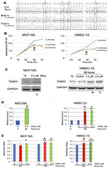 TASK3 expression and mitochondrial membrane potential as a function of KCNK9-US1 DMR demethylation in MCF10A cells and HMEC-15 normal cell strain. The optimal treatment conditions are 48 h for either 1.0 (red star) or 2.5 µM (green star) 5-aza-2′-deoxycytidine (5AzC) (A) Effect of 1.0 and 2.5 µM 5AzC on the DNA methylation of CpG sites 1–5 (boxes) in the KCNK9-US1 DMR in MCF10A. (B) Cell proliferation (viability) was tested using the MTT assay at 0–72 h; MCF10A cells and HMEC-15 normal cell strain were treated with 0 (blue line), 1.0 (red line), and 2.5 µM (green line) 5-AzC. Experiments were performed in triplicate. (C) Expression of TASK3 protein analyzed by western blotting at 0 and 48 h in MCF10A after treatment with 2.5 µM 5AzC and HMEC-15 normal cell strain after treatment with 1.0 and 2.5 µM 5AzC. GAPDH is used as the loading control. (D) Relative TASK3 expression in MCF10A after treatment with 2.5 µM 5AzC for 0 and 48 h and HMEC-15 normal breast cell strain after treatment with 1.0 and 2.5 µM 5AzC for 0 and 48 h. TASK3 expression was normalized to 0 h treatment (Control). Expression is for the western blots performed in triplicate for panel Figure 4C. Significant levels relative to 0 h control: *** p < 0.001. (E) JC-1 R/G ratio in MCF10A cells treated with 0, 1.0, and 2.5 µM 5AzC for 0, 24, and 48 h normalized to 0 h treatment (Control). JC-1 R/G ratio in HMEC-15 normal cell strain was treated with 0, 1.0, and 2.5 µM 5AzC for 0 and 48 h normalized to 0 h treatment (Control). Significant levels relative to 0 h control: * p < 0.05, ** p < 0.01, *** p < 0.001. Experiments were performed in triplicate. The uncropped blots and molecular weight markers are shown in Supplementary Materials.