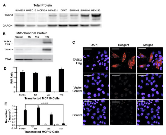 TASK3 expression and localization in breast cancer cell lines and mammary epithelial cell lines and cell strains. (A) Endogenous total TASK3 protein expression in human breast cell lines. TASK3 exhibited relatively increased expression in MDA231, DKAT, SUM149, SUM190, and HEK293 cells, but had lower expression in SUM225, HMEC15, and MCF10A cells. GAPDH serves as a loading control (n = 3 experiments). (B) Transient overexpression of TASK3-FLAG tag in the breast cancer cell line MCF10A results in expression of the exogenous construct in the mitochondria, as shown by western blotting. VDAC was used as a loading control for the mitochondrial fraction. Control untreated cells (Control), cells treated with transfection reagent alone (Txf), cells transfected with empty FLAG tag plasmid (Vec), and cells transfected with TASK3-FLAG tag plasmid. (C) Expression of the TASK3-FLAG construct by immunofluorescence. Control untreated cells (Control), cells transfected with empty FLAG tag plasmid (Vector Control), and cells transfected with TASK3-FLAG tag plasmid (TASK3-FLAG). TASK expression was detected by immunofluorescence using anti-FLAG tag antibody (Sigma-Aldrich, St. Louis, MO, USA). TASK3 transfected cells (TASK3-FLAG) were compared with those transfected with an empty vector control. (D) JC-1 Red/Green Ratio (R/G Ratio) in untreated MCF10A cells (Control), cells treated with transfection reagent alone (Txf), cells transfected with empty FLAG tag plasmid (Vec), and cells transfected with TASK3-FLAG tag plasmid (TK3). The R/G Ratio is a measure of mitochondrial membrane potential (ΔΨm), (n = 3 experiments). Significant levels relative to control: * p < 0.05, ** p < 0.01. (E) Caspase-3 activity, a measure of apoptosis initiation, normalized to DNA content in untreated MCF10A cells (Control); cells treated with transfection reagent alone (Txf); cells transfected with empty FLAG tag plasmid (Vec); and cells transfected with TASK3-FLAG tag plasmid (TK3). Cells were exposed for 4 h to either 0.0 µg/mL (grey bar) or 0.50 µg/mL (black bar) of staurosporine. Significant levels relative to cells not exposed to staurosporine: * p < 0.05, ** p < 0.01. The uncropped blots and molecular weight markers are shown in Supplementary Materials.