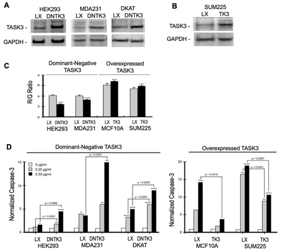 Stable expression of TASK3 protein (KCNK9 gene product): Using previously published methods [34], cell lines were transduced with empty LXSN, LXSN containing wildtype KCNK9, or LXSN containing KCNK9-G95E (dominant negative). Transduced cells were selected with G418 (Life Technologies): MDA231 using 2.0 µg/mL, DKAT using 0.50 µg/mL, SUM225 using 0.10 µg/mL, and HEK293 using 1.0 µg/mL. Expression of TASK3 was confirmed by SDS-PAGE and western analysis.