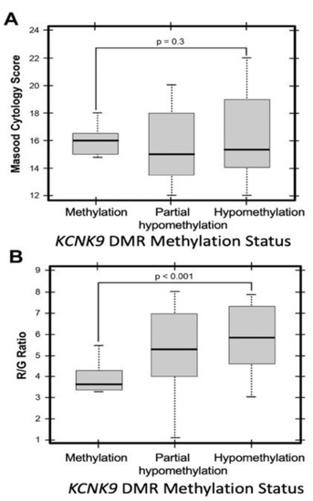 KCNK9-US1 DMR methylation in breast epithelial cells aspirated from women at high risk for developing breast cancer. (A) Box plot of Masood Cytology Index Score versus KCNK9-US1 DMR methylation status. (B) Box plot of R/G ratio versus KCNK9-US1 DMR methylation status: methylation, partial hypomethylation, hypomethylation.