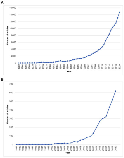 Expansion in the numbers of peer-reviewed published articles with the term “in vitro tumor models” (A) or “3D in vitro tumor models (B) (source: Scopus; Accessed over time, most recently 17 November 2021).