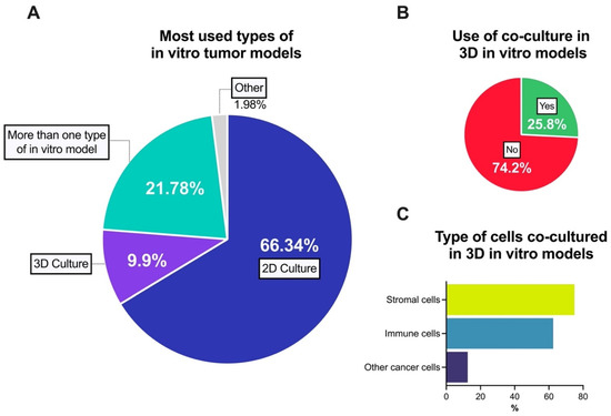 Use of 3D in vitro models in pre-clinical cancer research. (A) Main in vitro tumor models; (B) Use of co-cultured approach related to 3D in vitro tumor models; (C) Most used cell types to co-culture with cancer cells in 3D in vitro tumor models. Note: Figure 4C represents a question with multiple choice. Some respondents indicate that their co-culture models involved more than one type of cell.