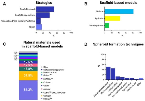 Overview of 3D culture models in cancer research. (A) Main strategies used for 3D models; (B) Types of scaffold-based models used in cancer research; (C) The most used natural materials in scaffold-based models; (D) Procedures used for spheroid formation. Note: some respondents indicated that they used more than one strategy, scaffold-based model type and/or spheroid formation technique. Results are represented as percentages (%).