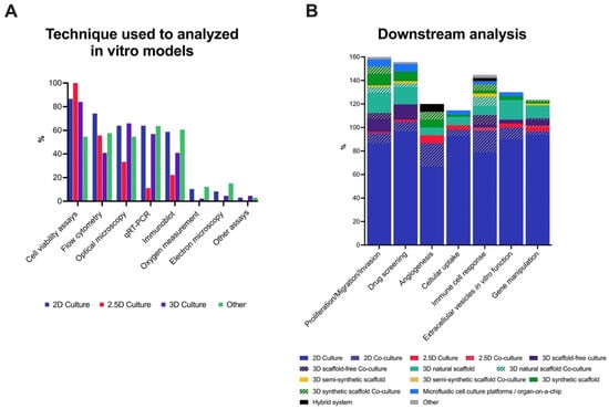 Analyzing the techniques used to characterize the cells of the different types of models, we observed that cell viability assays were the most commonly used method to analyze the cells in 2D, 2.5D and 3D culture. This was followed, in popularity, by flow cytometry and optical microscopy. Another trend we can observe in the case of other models, where the most used techniques were quantitative reverse transcription PCR (RT-qPCR), immunoblotting and flow cytometry (see Figure 6A).