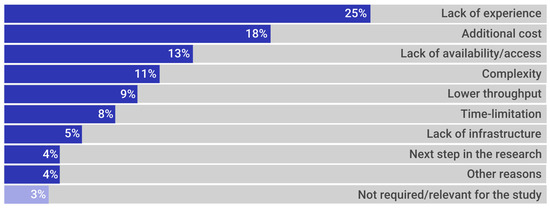 We asked those who indicated not using 3D culture models at all about the main reasons why this was so. The principal reasons given were lack of experience (25%) and the additional cost when compared to 2D cultures (18%). However, 4% of the respondents indicated an intent to develop a 3D culture in the next step of their research (Figure 7).