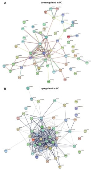 Employing a twofold change cut-off, 58 genes were identified as down-regulated in UC compared to normal tissues, whereas 50 were upregulated. These genes are comprehensively listed in the Supplementary Materials (Data file S1).