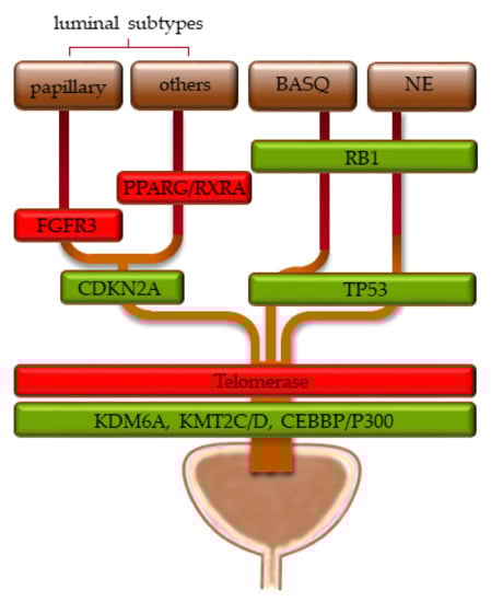 Proposed sequence of genomic changes in urothelial carcinogenesis, proceeding from bottom to top. Green boxes indicate loss of function, red boxes indicate oncogenic activation. The width of the boxes indicates the approximate distribution of the genomic alterations across the molecular subtypes (see Section 1.2 for their definitions).