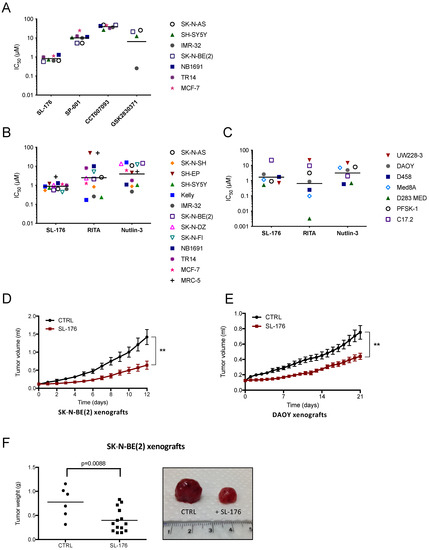 For medulloblastoma and sPNET cell lines, SL-176 had similar effects on viability as the p53 inhibitors RITA and Nutlin-3. However, no significant differences between the mean IC50 values in medulloblastoma cell lines were observed (mean IC50 for SL-176: 1.1 µM, RITA: 0.41 µM and Nutlin-3: 3.4 µM; p = 0.26) (Figure 4C, Figure S3B and Table S2B). All three drugs achieved complete inhibition of most cell lines tested (Figure S3B). The non-cancerous cell lines MRC-5 and C17.2 were less sensitive to SL-176 than the cancer cell lines (IC50 for SL-176: 2.8 and 22 µM, RITA: >50 and 9.5 µM and Nutlin-3: 5.3 and 1.0 µM) (Figure 4B,C, Figure S3B and Table S2B).