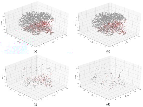 Interpretation of the 3D t-SNE plot visualization of the HAM10000 dataset where the red dots indicate melanoma cases while gray dots represent benign lesions. The following figures present the distribution of malignant and benign cases for the (a) entire dataset, (b) trunk-extremities dataset, (c) face-head dataset, and (d) acral dataset.