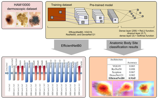 An overview of our method is illustrated in Figure 4. We reuse deep CNN models pretrained on the ImageNet dataset for feature extraction using the prepared HAM10000 dataset for the classification of skin lesions into anatomic sites of the body. We adjust the classifier, which has a three layer structure. As a result, we generate classification outcomes for the most widely used pretrained networks and analyze them. We further employ the Grad-CAM algorithm to generate heatmaps in order to conduct multi-task learning model interpretability.