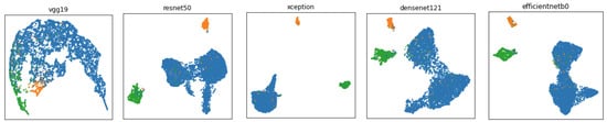 Visualization of full dataset feature distributions extracted with VGG19, ResNet50, Xception, DenseNet121, and EfficientNetB0. These graphs visually illustrate the separability of three anatomic sites.