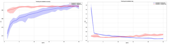 Average training and validation accuracy (left) and loss (right) during training of DenseNet121 for five times with maximal and minimal deviation areas marked in color (blue for training and red for validation).