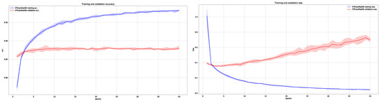 Average training and validation accuracy (left) and loss (right) during training of EfficientNetB0 for five times with maximal and minimal deviation areas marked in color (blue for training and red for validation).
